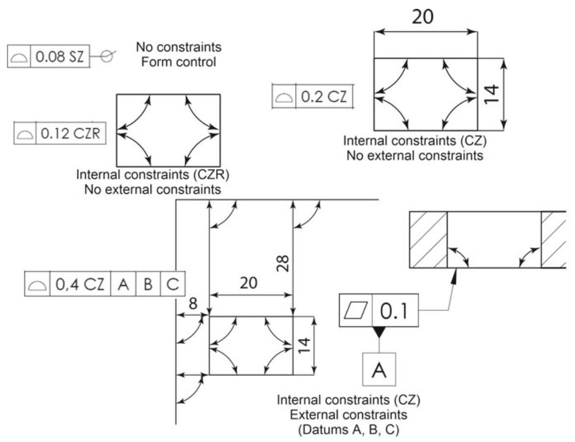 Fig. 10.21 Examples of the internal constraints introduced by the CZ and CZR modifiers and the external constraints introduced by the datum system