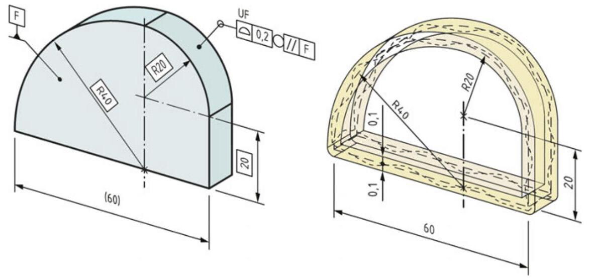 By default, the tolerance zone is symmetrical with respect to the ideal profile, but it is also possible to indicate a non-symmetrical zone through the use of modifiers (Fig. 10.12). In fact, the ISO 1101 standard has introduced the UZ modifier, with which the number after this symbol represents the deviation required by the nominal, and it can therefore be either negative (within the ideal profile) or positive (external).