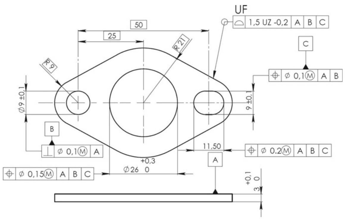 The non-redundant degrees of freedom for the tolerance zone defined by the upper tolerance indicator are locked by means of reference to a datum system, and the UF modifier could therefore have been omitted. In the case of the tolerance zone defined by the lower tolerance indicator, the UF modifier is necessary to synchronise the offset of the two parts of the tolerance zone.