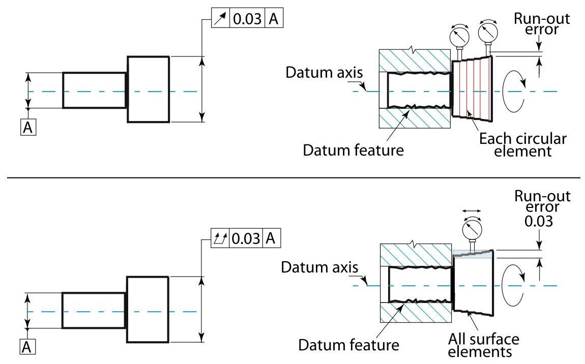 Figure 11.3 illustrates the difference between the two types of tolerance and shows the interpretation of the control carried out by means of a dial indicator; in the case of circular run-out, each circular feature of a surface is controlled independently, while the workpiece rotates around the datum axis. Circular run-out provides a 2D control of the circular elements of a surface relative to the datum axis, and a tolerance zone is created and applied independently to each circular cross section of the surface of the part.