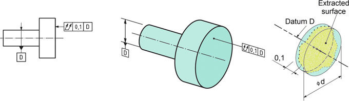 It is also possible to control the total axial run-out in the same way as for the workpiece shown in Fig. 11.10; the extracted surface should fall within two parallel planes (at a distance that is equal to the tolerance) and perpendicular to datum axis D.