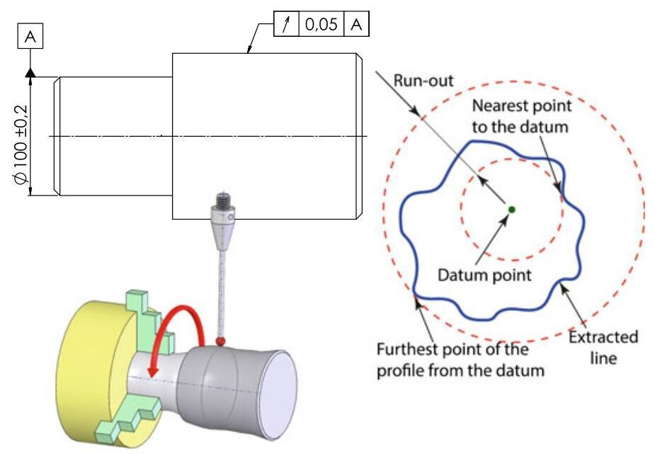 In the total run-out case, the control applies to the entire surface simultaneously; the part is rotated by {360}^{ \circ } and the dial indicator is moved along the surface that has to be measured. In this case, the run-out error represents the difference between the maximum and minimum error indicated on the dial indicator at any position of the dial indicator. Total run-out provides a 3D control of all the surface elements of the considered feature and the tolerance applies simultaneously to all circular and profile elements of the surface.