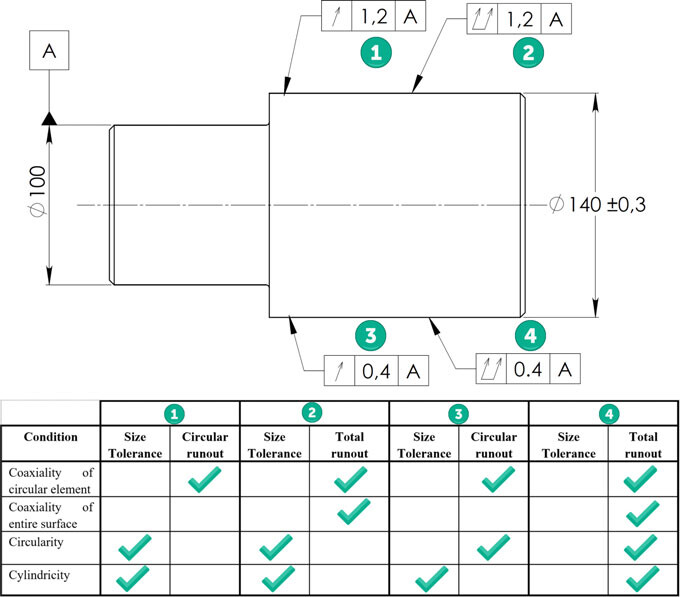 The datum feature in run-out tolerances may be constituted by a single axis, two axes considered to be coincident or an axis plus a plane perpendicular to it.