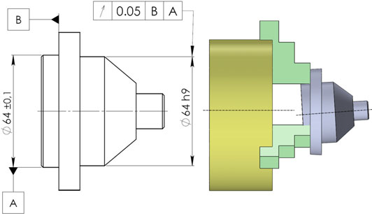 Fig. 11.11 Arun-out tolerancemay also be controlledwith two datums: the component is controlled by means of a self-centring device, which is first placed on datum B and the jaws are then tightened