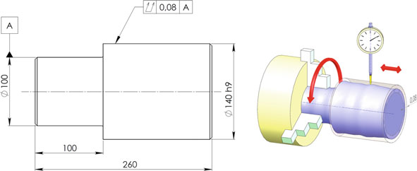 In the total run-out case, the control applies to the entire surface simultaneously; the part is rotated by {360}^{ \circ } and the dial indicator is moved along the surface that has to be measured. In this case, the run-out error represents the difference between the maximum and minimum error indicated on the dial indicator at any position of the dial indicator. Total run-out provides a 3D control of all the surface elements of the considered feature and the tolerance applies simultaneously to all circular and profile elements of the surface.