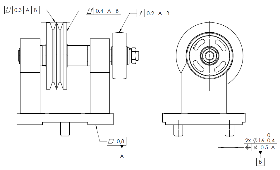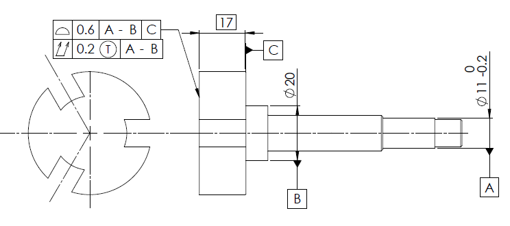 The run-out tolerance may also be controlled with two datums, as shown in Fig. 11.11. In this case, the sequence of indications of the datums becomes important: the component is controlled with a self-centring device, which is first placed on datum B and the jaws are then tightened.