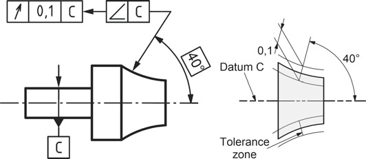 Fig. 11.7 Use of a “direction feature” symbol to indicate the measurement direction of the circular run-out error. The tolerance zone is limited within any conical section of the specified angle by two circles 0.1 mm apart, the centres of which coincide with the datum