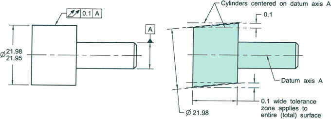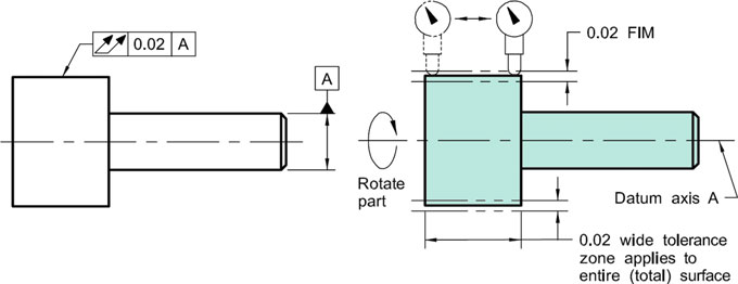 Y14.5 2009 (Fig. 11.13): “Total runout provides control of all surface elements. The tolerance is applied simultaneously to all circular and profilemeasuring positions as the part is rotated 360 º about the datum axis. When verifying total runout, the indicator is fixed in orientation normal to and translates along the toleranced surface. The entire surface must lie within the specified runout tolerance zone (0.02 full indicator movement) when the part is rotated 360° about the datum axis with the indicator placed at every location along the surface in a position normal to the true geometric shape, without resetting of the indicator. The feature must be within the specified limits of size.”