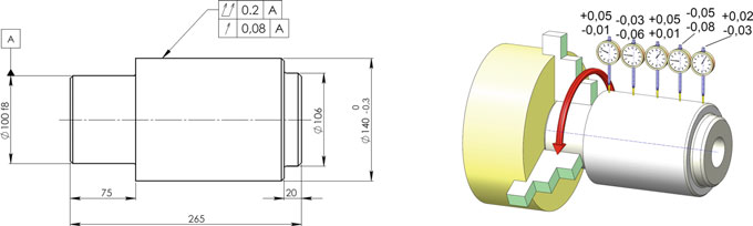Figure 11.12 shows a circular run-out control and a total run-out control through the total movement of a set of dial indicators on each round feature of the surface, while the workpiece rotates around the datum axis. The circular run-out error is obtained in the section with the largest variation (0.06 mm, less the assigned tolerance). The total run-out is the difference between the maximum reading (+0.05 mm) and theminimum reading (–0.08 mm) over the entire surface, that is, 0.13 mm, which is less than the run-out indicated in the design phase.