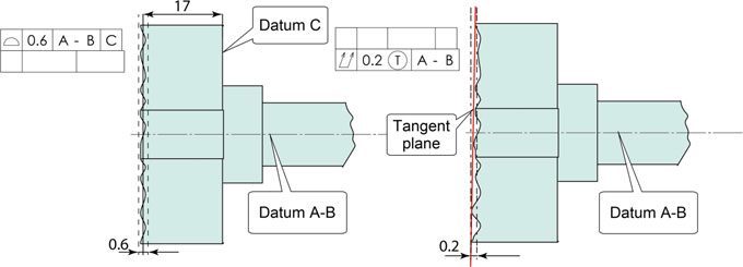 The extent of the tangent plane is circular with a radius equal to the distance from the rotation axis to the furthest point on the toleranced surface. In Fig. 11.17, the profile tolerance zone is located with reference to datum plane C and oriented to datum A–B, while the tangent plane, in contact with the high points of the feature, should be within the 0.2 mm wide tolerance zone perpendicular to datum A–B.