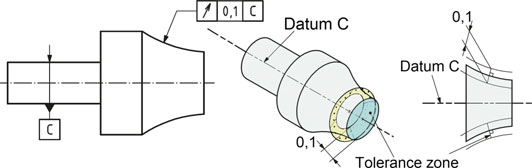 Fig. 11.6 The tolerance zone is limited within any conical section by two circles 0.1mm apart, the centres of which coincide with the datum. The width of the tolerance zone is always normal to the specified geometry, unless otherwise indicated