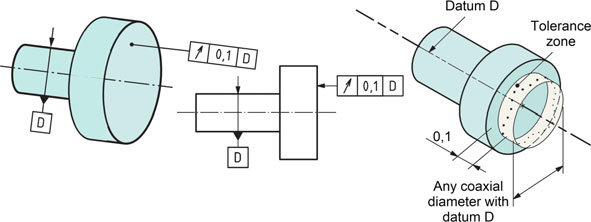 In this case, a three-dimensional error zone is controlled and therefore, in the case of radial run-out, the extracted surface should fall within two coaxial cylinders, with a difference in radii equal to the run-out tolerance, the axes of which coincide with the datum axis (Fig. 11.8).