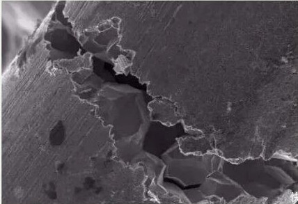 在奥氏体不锈钢焊接接头中,晶间腐蚀可以发生在热影响区,也可以发生在焊缝表面或熔合线上。晶间腐蚀是奥氏体不锈钢较常见的破坏形式。晶间腐蚀沿晶界进行,使晶界产生连续性的破坏。这种腐蚀开始于金属表面,逐步深入其内部,直接引起破裂。