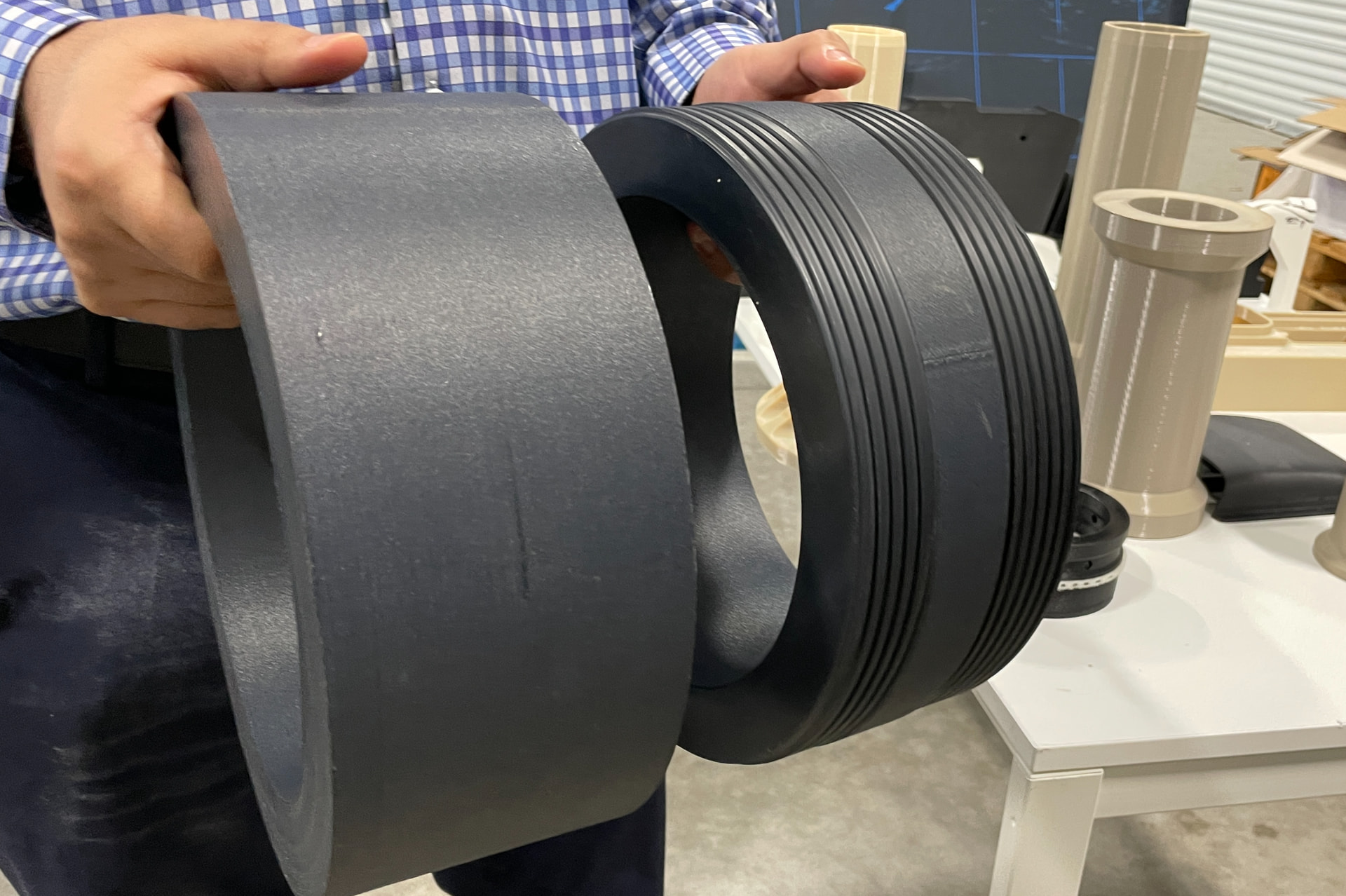 实际零件展示:3D打印/机加工的PEEK油气密封件和管件,黑色为碳纤增强版。