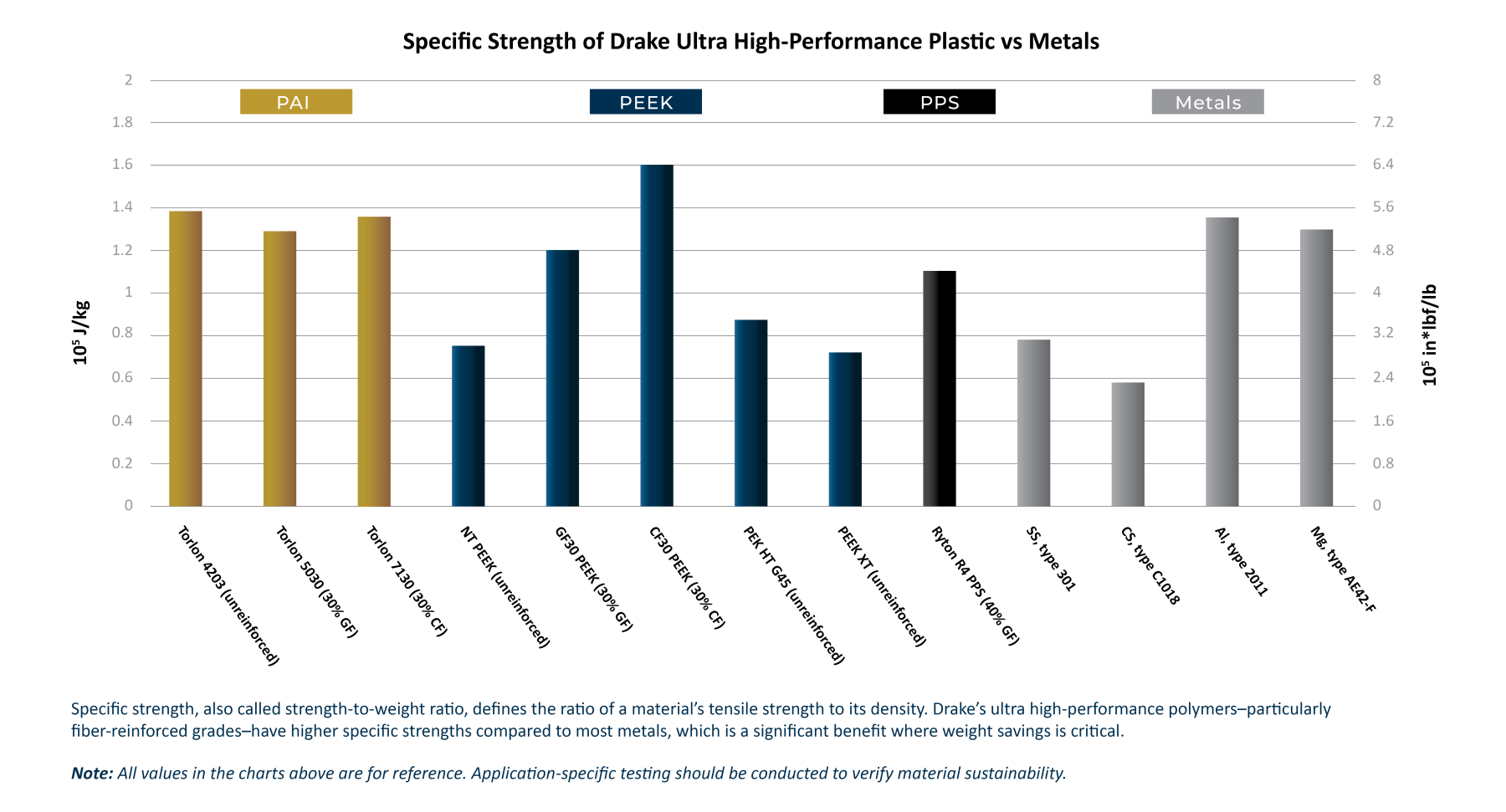 比强度对比图(PEEK CF30 vs 金属):PEEK碳纤增强版的比强度(强度/密度)已全面超越不锈钢和铝合金,是轻量化设计的杀手锏。