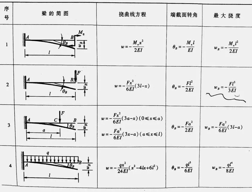 在材料力学中,通俗上所说的弯曲变形又称挠度,定义为在受力或非均匀温度变化时,杆件轴线在垂直于轴线方向的线位移,或板壳中面在垂直于中面方向的线位移,其英文为Deflection。运用叠加法可以推导出梁在简单载荷作用(包括悬臂、简支等)下的变形,下图列出了部分公式[1]: