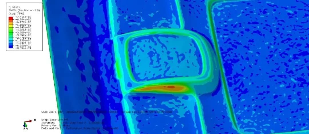 当安全因数为1.5时,此材料的许用应力为5MPa。从图中可知,橙色和红色部分的应力大于5MPa。可以判定,这些区域有失效风险。