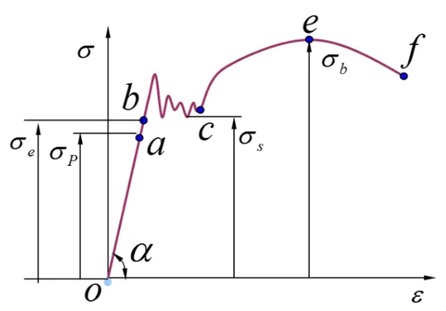 首先,材料拉伸可以分为4个阶段:即弹性阶段–屈服阶段–强化阶段–局部变形阶段。图中ob 为弹性阶段,此阶段遵循胡克定律,即