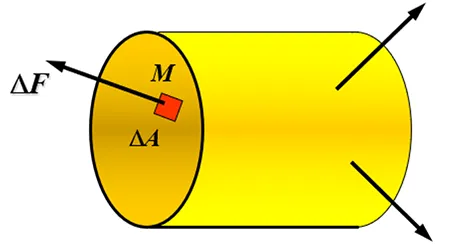 应力是内力的分布集度(应力是针对某“点”而言的,描述一点的应力时,应该指出这个点的位置及过这个点的平面的方位),为了描述截面上一点的应力,围绕该点取一个微面积 \Delta A,如图。在这个微面积上内力系的合力为 \Delta F,由于这个面积足够小,假设其内力为均匀分布,则可得到其平均应力,再取平均应力的极限,可得到该点的总应力或全应力,总应力的方向随着所取点的位置的变化而变化,显然总应力是矢量,其方向与截面的关系是任意的。再把总应力分解成两个分量,一个是垂直于截面称为正应力,一个与截面相切称为切应力。