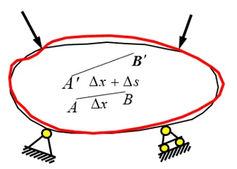 如图考察构件内任一点A,在A点附件取任意点B,AB的长为 \Delta x,在外力作用下构件发生变形,A、B两点均产生位移到新的位置,则两点之间的距离变成了 \Delta x+\Delta s,设在Dx范围内其变形是均匀的,可得平均线应变
