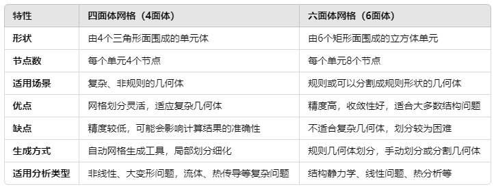 在有限元分析中,网格划分是一个至关重要的步骤,网格的形状和类型会直接影响到分析的精度和计算效率。常见的网格类型包括四面体网格(4面体)和六面体网格(6面体)。它们各自具有不同的优缺点,适用于不同的几何体和分析类型。