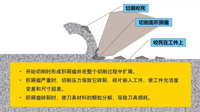 什么是积屑瘤?:工件材料熔焊或咬死在切屑刃上的积留物。