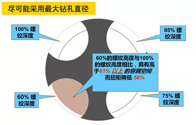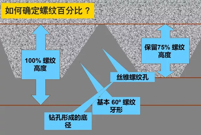 确定螺纹百分比:钻头钻孔尺寸确定了螺纹底径与螺纹高度的百分比,你使用的钻头直径越大,达到的螺纹高度比越小。