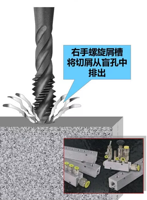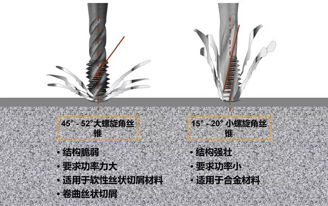 挤出切削,螺旋排屑槽丝锥:最适合用于盲孔和深孔加工,推荐用于产生粘连切屑的材料,非常适合用于断续切削。螺旋排屑槽丝锥的锥芯很薄,是丝锥设计中最脆弱的部分。因此,速度要比直排屑槽丝锥低30%~40%,以免断裂。