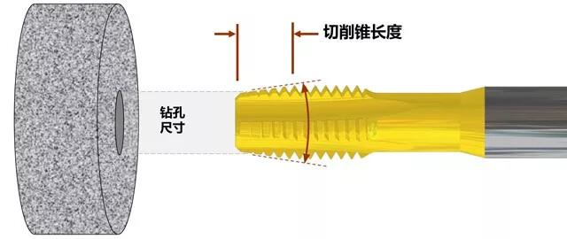 丝锥切削锥:每增加一个切削锥齿,丝锥使用寿命都会按指数延长。测试表明每加半个切削齿螺纹, 刀具使用寿命就会加倍。与其他刀具不同, 丝锥切屑荷载只能随着排屑槽数量和切削锥长度改变而改变。