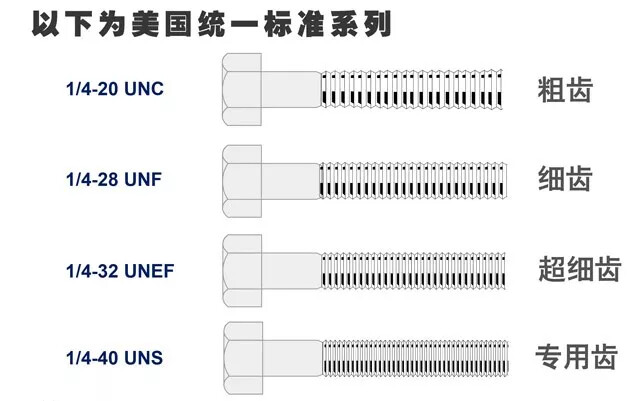 英制螺纹:英制螺纹是螺纹尺寸用英制标注,是美国、英国与加拿大根据统一的体系开发的。