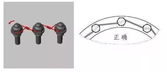 串联钢丝防松是将钢丝穿入螺栓头部的孔内,将各螺栓串联起来,起到相互牵制的作用。这种放松方式非常可靠,但拆卸比较麻烦。
