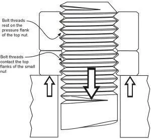 双螺母防松也称对顶螺母防松,当两个对顶螺母拧紧后,两个对顶的螺母之间始终存在相互作用的压力,两螺母中有任何一个要转动都需要克服旋合螺纹之间的摩擦力。即使外载荷发生变化,对顶螺母之间的压力也一直存在,因此可以起到防松作用。