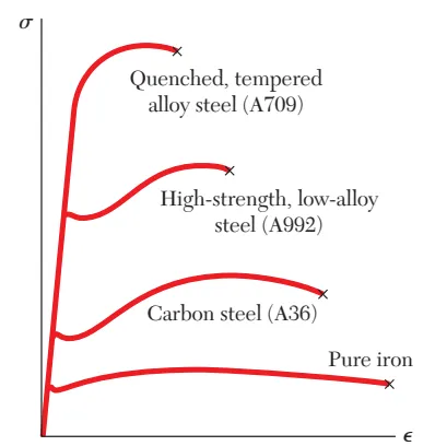 材料的强度、延展性以及耐腐蚀性,受到合金元素、热处理工艺以及加工工艺的影响很大。但是弹性模量不同,如图1所示,纯铁、碳钢、高强低合金钢和经过热处理的合金钢,在强度、延展性两方面差异可以很大,但是它们在弹性阶段的弹性模量却是一致的。