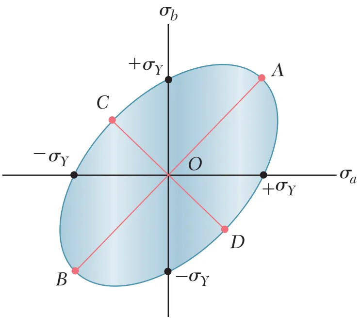 作为材料屈服的边界条件,\sigma _{a} ^{2} - \sigma _{a} \sigma _{b} +\sigma _{b} ^{2} <\sigma _{y} ^{2} 是一椭圆曲线,如图2所示。