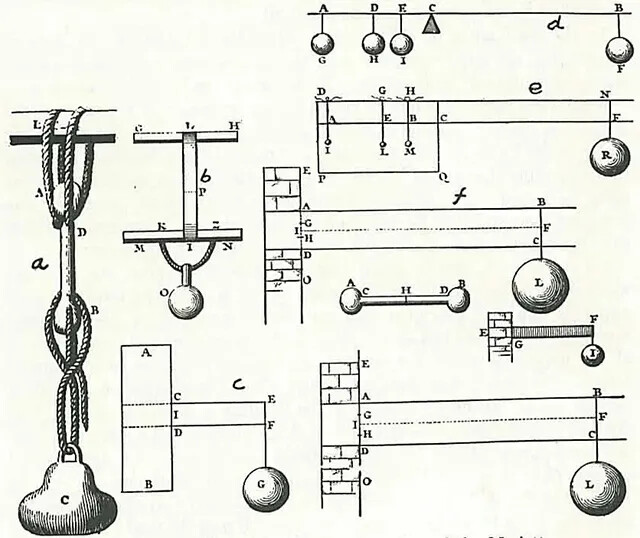 17世纪80年代,马略特曾负责设计一条通向凡尔赛宫的供水管线,由于设计需求,他对梁的抗弯强度产生了兴趣,他利用木杆和玻璃杆做了实验,如下图a 表示在他的木材拉伸试验中所采用的装置,b为纸的拉伸试验,得出了许多重要结果。