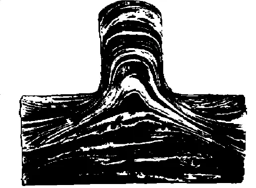 1867年,特雷斯卡利用氧化汞腐蚀显示金属部件中的流线,如图4所示,由此说明了金属在加工形变过程中内部金属的流动情况。这或许可被视为力学的化学测试法,虽然这一方法在力学教学中少见,但金属研究和生产检验中宏观腐刻一直都是常用的重要方法。