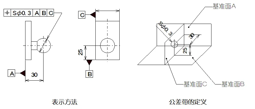 公差带前加注记号Sφ时、公差带是直径0.3mm的球内区域。