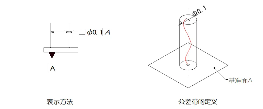 垂直度, 即通常所说的两要素之间保持正交的程度,表示零件上被测要素相对于基准要素,保持正确的90°夹角状况。