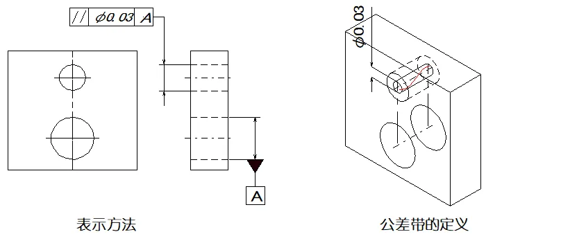 平行度公差是被测要素的实际方向,与基准相平行的理想方向之间所允许的最大变动量。