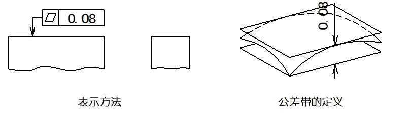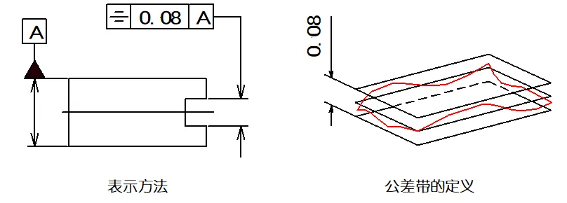 公差带是位于距离0.08mm的两个平行平面之间的区域