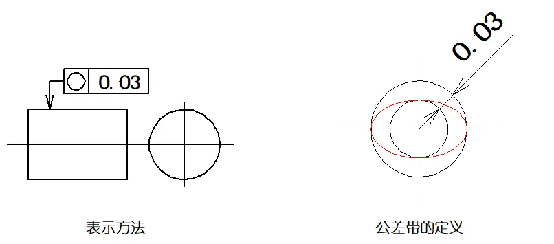 公差带必须在同一正截面上,半径差为公差值0.03mm的两个同心圆之间的区域。