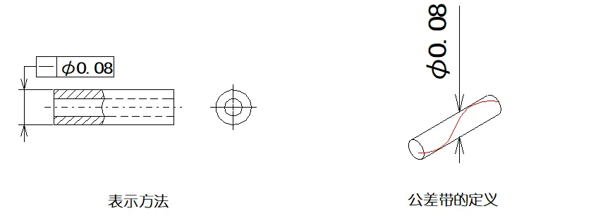 公差值加注记号时,公差带是直径0.08mm的圆柱之间区域。
