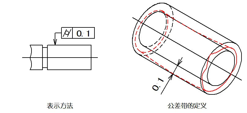 公差带是距离为半径差0.1mm,且与基准同轴的两圆柱面之间的区域
