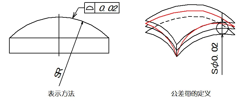 公差带是由包络一系列直径为0.02mm的球的两条包络线之间,球的中心理论上应位于理论正确几何形状的面上
