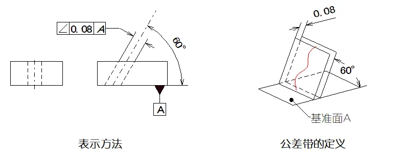 该公差带应平行于垂直于基准A的平面B,并与基准A呈理论正确角度60°。