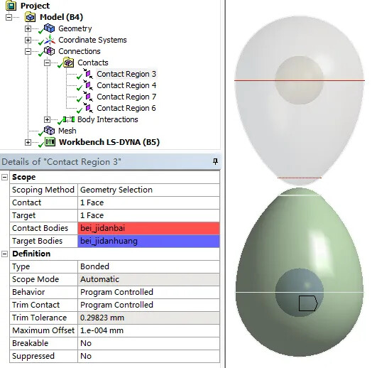 Expand "Contacts" and add 4 bonded contacts, corresponding to the two pairs: eggshell and egg white, egg white and egg yolk. Refer to the previous article: *Common Constraint Types in Ansys Workbench* for details. Keep the "Body Interactions" settings as default.