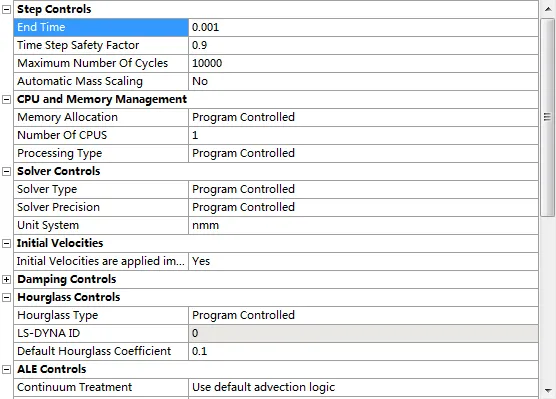 Click on “Analysis Settings,” and set the simulation time parameters in the list below: End time to 0.001s, Time Step Safety Factor to 0.9, and Maximum Number of Cycles to 10,000. Special note: It is important to set these parameters reasonably and adjust them gradually based on the solution results, as overly long solution times can occur!