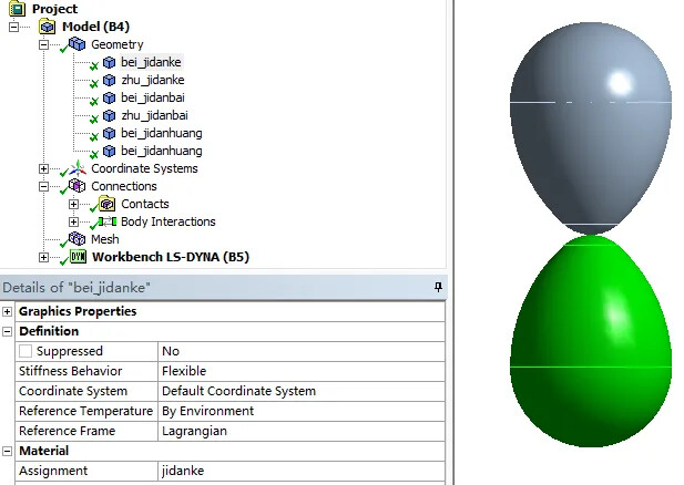 Is it true that the egg that actively crashes into another egg is more likely to break? This article intends to use Ansys Workbench’s explicit dynamics analysis module LS-DYNA to perform a mechanical analysis of both eggs involved in ‘egg crashing’ and propose strategies with a higher probability of winning and high feasibility. The detailed steps are as follows.