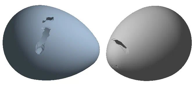 Use SolidWorks to complete the egg modeling, including the eggshell, egg white, and yolk. The length L is 60mm, the width B is 44mm, and the distance w is 10mm, which are used to establish the basic shape of the egg. The eggshell thickness is set to 0.35mm, and the yolk is approximated as a sphere with a radius of 10mm.