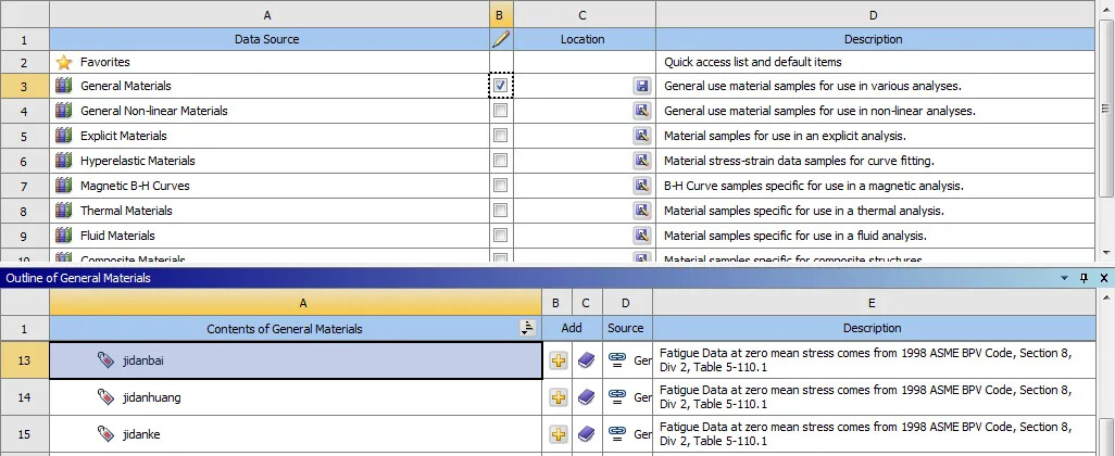 Double-click “Engineering Data” to enter the editing environment. Right-click the blank area and select “Engineering Data Sources.” Check the box next to “General Materials,” right-click any material in the list below, select “Duplicate,” rename it, and set the material properties according to the table below.
